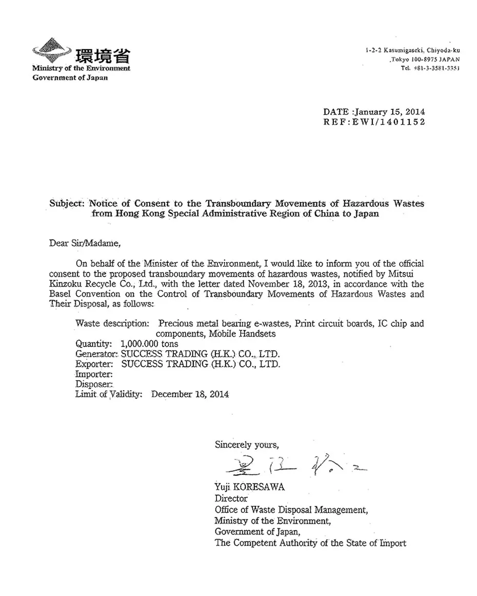 Recognition from Japanese Government on handling computer and electronic parts